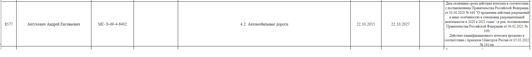 Включен в Реестр Минстроя России в качестве аттестованного эксперта по направлению "Автомобильные дороги" за номером 8577 (http://www.minstroyrf.ru/trades/gosuslugi/1/).